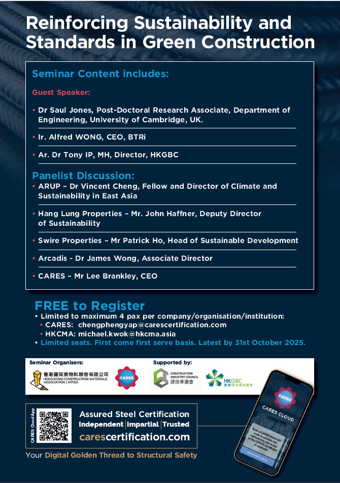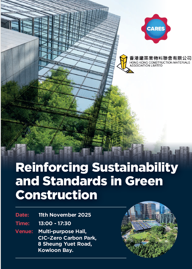 Content: | Co-organised by the Hong Kong Construction Materials Association(HKCMA) and the CARES, the seminar would explore the vital theme of“Reinforcing Sustainability and Standards in Green Construction”. Product Certification(CIC GPC) and a panel discussion featuring developers and consultants on Sustainable Construction in Hong Kong & Real Estate Sector would be conducted. Seminar Content includes: Guest Speaker: * Dr Saul Jones, Post-Doctoral Research Associate, Department of Engineering, University of Cambridge, UK. * Ir. Alfred WONG, CEO, BTRi * Ar. Dr Tony IP, MH, Director, HKGBC Panelist Discussion: * ARUP – Dr Vincent Cheng, Fellow and Director of Climate and Sustainability in East Asia * Hang Lung Properties – Mr. John Haffner, Deputy Director of Sustainability * Swire Properties – Mr Patrick Ho, Head of Sustainable Development * Arcadis - Dr James Wong, Associate Director * CARES – Mr Lee Brankley, CEO FREE to Register * Limited to maximum 4 pax per company/organisation/institution: • CARES: chengphengyap@carescertification.com • HKCMA: michael.kwok@hkcma.asia * Limited seats. First come first serve basis. Latest by 31st October 2025 |